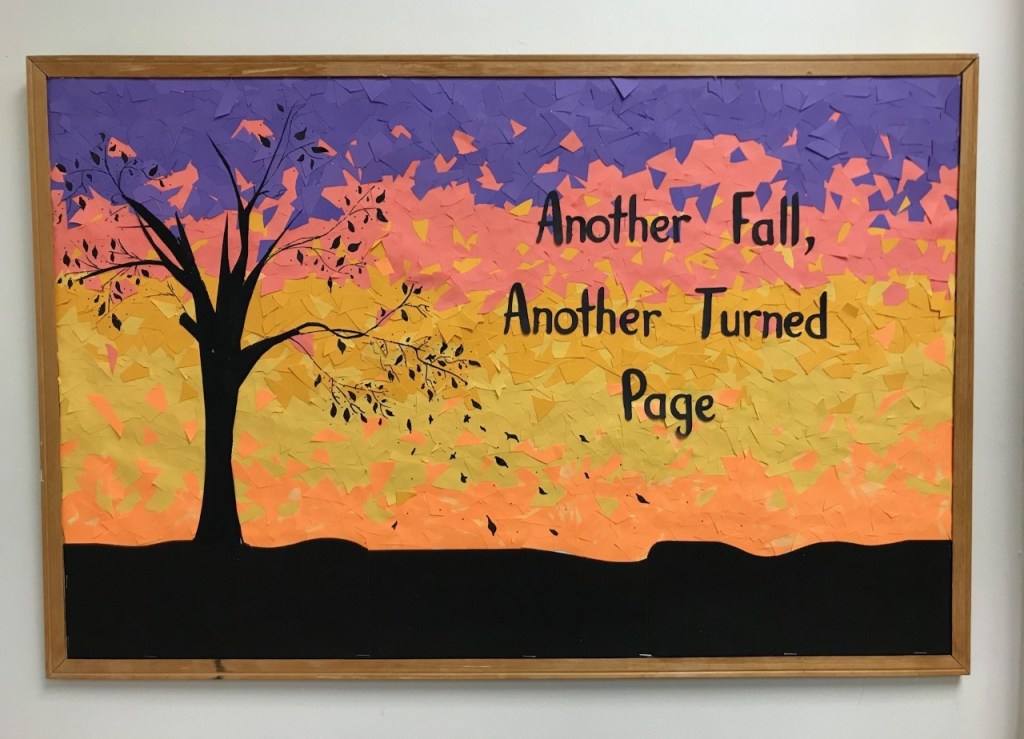 Observations: 1) Our main office staff decorates the bulletin boards in the English Department office throughout the year, adjusting the images and captions for each season. 2) This month, Rhianna took the lead for the design and its implementation. The result: a multi-colored, textured collage of paper and ink drawings to represent the fall landscape. 3) Many thanks to Rhianna and our other student office assistants — Wesley Danielson (BA ’21, Theatre) and Thai Lopez (BA ’23, English) — for all of their help during all seasons of the year!