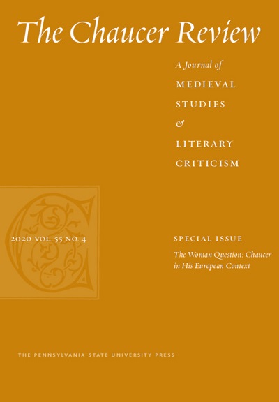 Wendy Matlock and Betsy McCormick, eds, “Special Issue: The Woman Question: Chaucer in His European Context.” The Chaucer Review, vol. 55, no. 4, 2020, pp. 343-499.