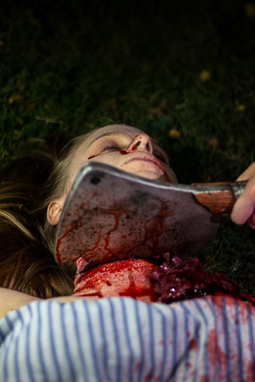 The most important factor of this image is that there is bruising on the nose and around the eyes to show suffocation, as well as blood coming out of the nose to illustrate possible breakage in that area from when the narrator “pulled the heavy bed over him.” When choosing the specific bruising pattern for this makeup, I did some research. The website Explore Forensics had an article regarding suffocation and smothering written by Jack Claridge. He states, “Throughout the investigation of a death by suffocation or smothering the pathologist will look for the tell tale signs: the bloodshot eyes, the high levels of carbon dioxide in the blood and will also look for bruising around the nose and mouth.” I will mention that I was not able to portray the bloodshot eye in the makeup because I was not able to get red eyedrops in time. I also did not have the heart popping out of the chest in this image because the narrator finally found peace from the beating after then old man was dead.