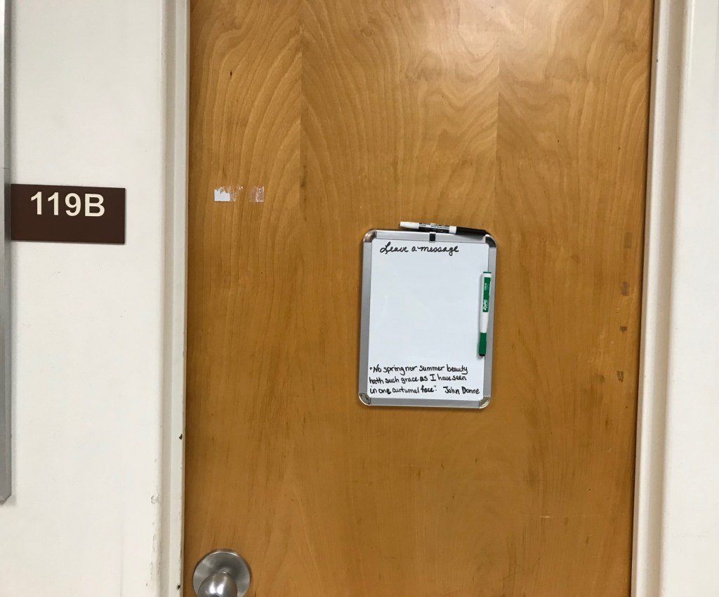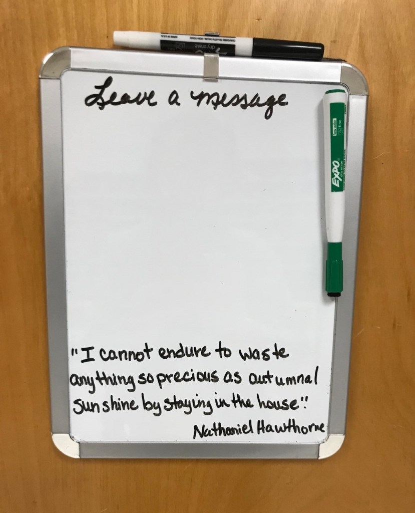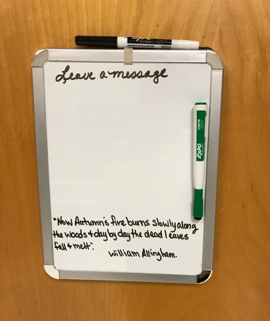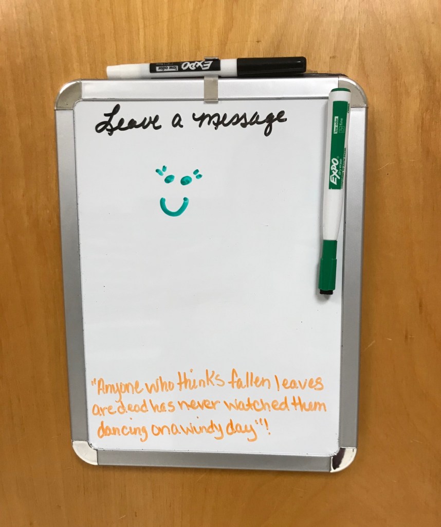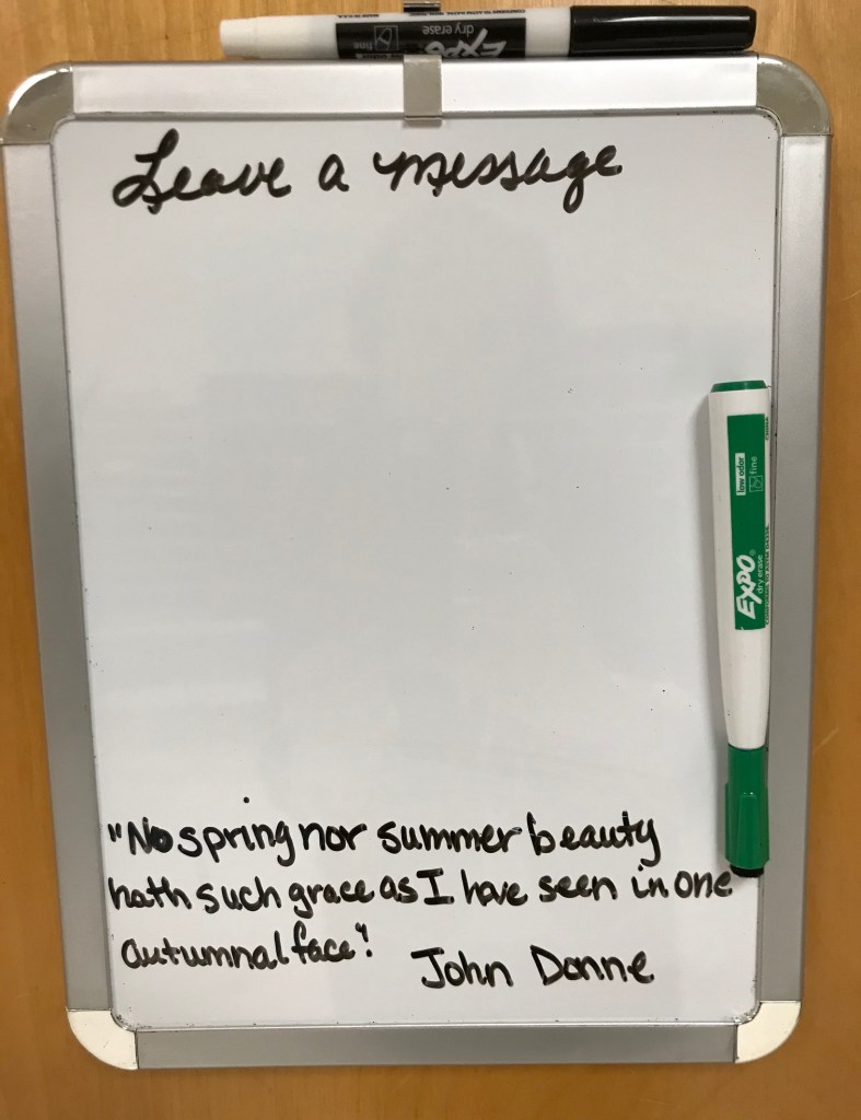 Observations: For the past few weeks, when walking through our department mailroom in ECS 119, I’ve noticed an autumn-themed quote on the door to our custodial storage area. Every day or so, a new quote appears.