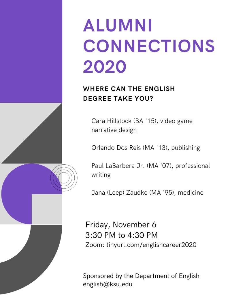 Our next Alumni Connections event is coming up on Friday, November 6 at 3:30pm via Zoom, given our the current global pandemic —