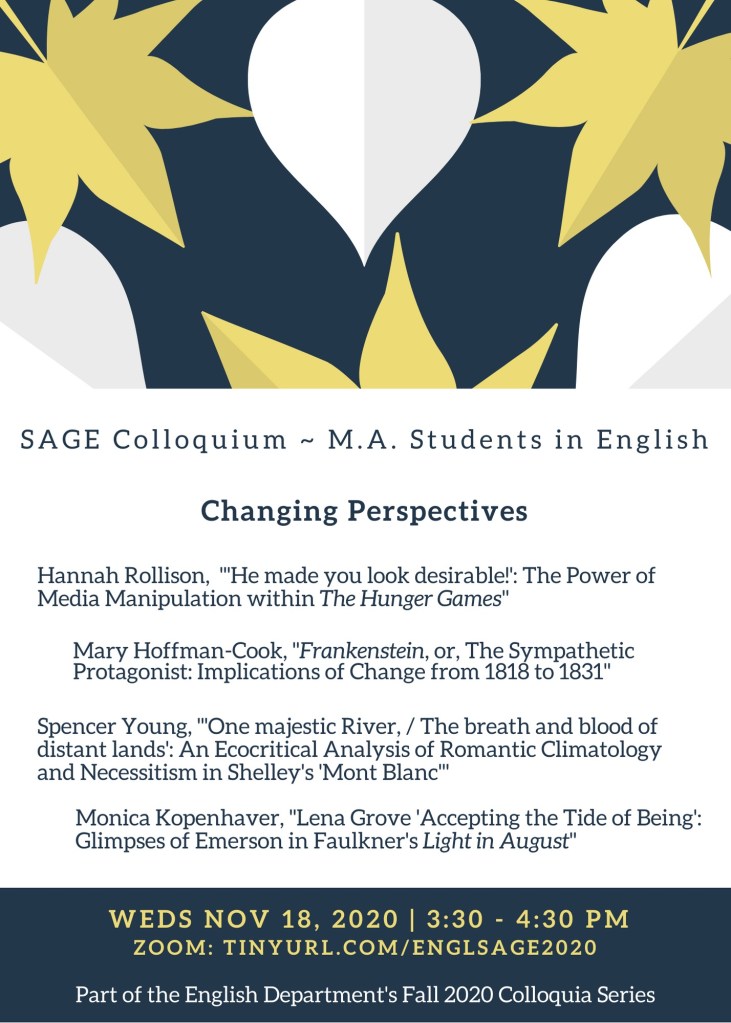 Observations: 1) Ten years later, we’re getting ready for the Fall 2020 SAGE Colloquium, which will once again showcase the range of scholarly interests of our M.A. students across several Tracks: Hannah Rollison (MA ’22, Cultural Studies), Mary Hoffman-Cook (MA ’22, Composition and Rhetoric), Spencer Young (MA ’22, Creative Writing), and Monica Kopenhaver (MA ’21, Literature). 2) We’ve upped our visual design for event flyers since 2010, thanks to online platforms! 3) We’re looking forward to these presentations tomorrow afternoon — and you can register to join us at tinyurl.com/englsage2020.