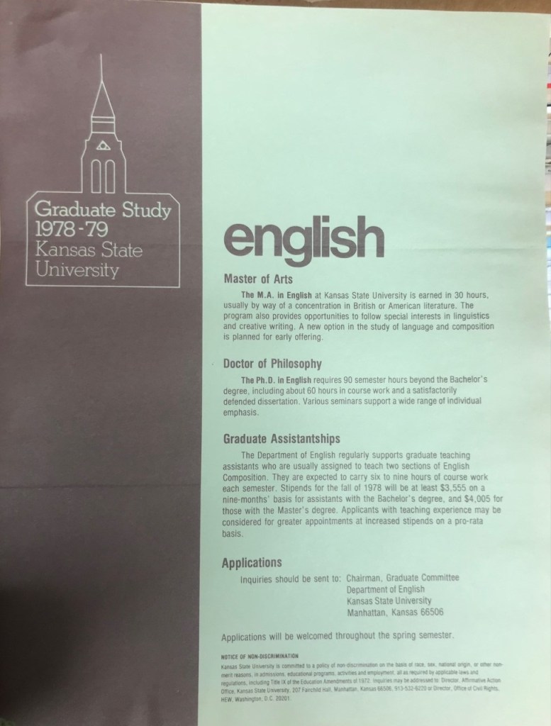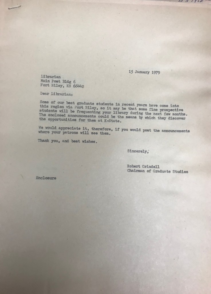 Observations: 1) The label on the folder is slightly misleading, as the first document within bears the date of 15 January 1979. 2) What was true in 1979 is still true today: some of our best graduate students do indeed arrive at our M.A. program because of relocation to Fort Riley. 3) “Chairman of Graduate Studies” is a title of its moment, reflecting the demographics of department leadership c. 1979. For the past 30 years, we’ve used the more gender inclusive title “Director of Graduate Studies.” 4) Devising recruitment strategies, it seems, is a perennial pursuit of the Department’s graduate program. 5) I think we’ll need to revive this publicity approach! Those who are drawn to the library on base may indeed be interested an M.A. in English.
