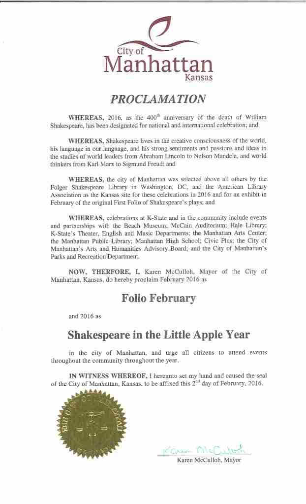 Object: Scan of the proclamation from then-Mayor Karen McCulloh of Manhattan, KS, establishing February 2016 as “Folio February” and 2016 as “Shakespeare in the Little Apple Year,” in honor of the month-long visit of Shakespeare’s First Folio to Kansas State and Manhattan, February 2016