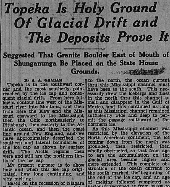 In my research, I looked across articles from 1929 to 2021. One clear example of settler colonialism I found is in the first article published, written by A. A. Graham, a Topeka attorney, published in the Topeka State Journal on Sept. 7, 1929. In the article, Graham calls Topeka “holy ground” of the glacial drift that brought In ́zhúje ́waxóbe to Kansas. As such, Topeka should take the boulder from the banks of Shunganunga creek and turn it into a monument. Throughout the article, he focuses on the geology of the boulder. He also calls it a “pioneer,” which erases the Indigenous history of the boulder and glorifies it as a symbol of the white pioneers who removed the Kaw Nation from their lands.