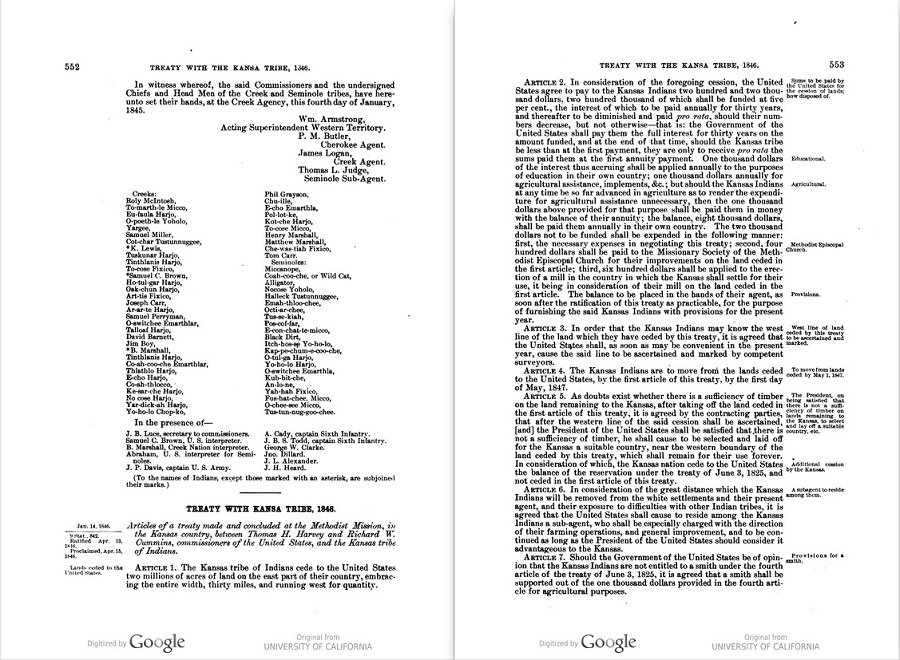 The treaty I analyzed the most was the Treaty of 1846 between the Kanza and the United States. Throughout studying this treaty—specifically the word choice and diction of the document—I noticed an imbalance of power that attributed superiority to the U.S. government and inferiority with the Kaw Nation. I spent many of my research hours creating annotations that would not only make these treaties more comprehensible to a broader audience but would also help explain the treaty’s problematic elements. For example, the first article of the document states that the Kaw Nation ceded the outlined amount of land to the U.S. government. According to the Oxford English Dictionary (OED), cede can signify “to give way; to yield or surrender something,” which has a different meaning than the word sell. This one example of diction reiterates the hierarchy of superiority and inferiority that is detectable throughout the entire document