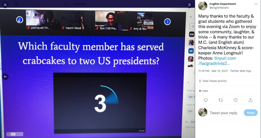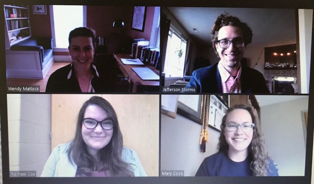 Option 3: Mary Cook (MA ’22), Jefferson Storms (MA ’22), & Rachael Cox (MA ’21) present at the 2021 Graduate Literature Symposium, chaired by Wendy Matlock on behalf of the Literature Track