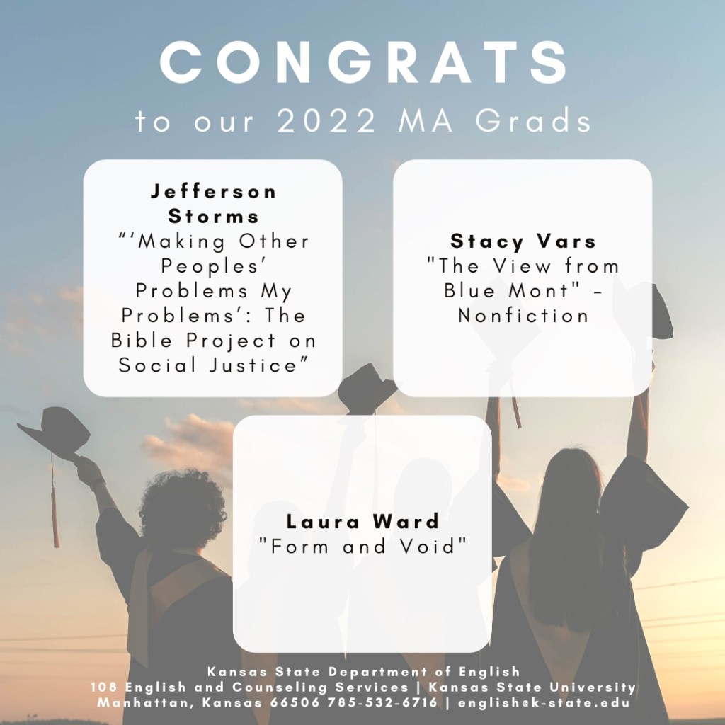 Observations: 1) Each spring, for many years, we have displayed the M.A. Project and Thesis titles of our graduating M.A. students at our annual spring Awards Banquet. 2) This year, as in 2020 and 2021, COVID prompted us to develop an alternative: with the help of our 2022 Graduate Program Assistant Hannah Rollison (MA ’22), we posted one of these images each day this week on our social media platforms. 3) The M.A. Project or thesis is the capstone accomplishment for our M.A. students as they complete the program and thus an important sign that graduation is at hand. 4) Congratulations to all of our 2022 M.A. graduates!