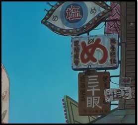 Nichiren Buddhism has a thing for eyes, by the way. A particular ritual performed in Nichiren is the “eye-opening ceremony” (kaigen kuyô, or開眼供養) in which the pupils on a Buddha statue or picture are painted by a priest, thus consecrating that Buddha image as an incarnation of Buddha himself. (See Sir Charles Elliot’s book Japanese Buddhism detailing Nichiren’s “Eye Opener” treatise, called kaimokushô in Japanese.) This is an important detail, as the film’s eye-shaped sign has also had its pupil painted. However, rather than a plain black dot, it has been christened with the kanji for “salt” (塩), a substance long-considered sacred and purifying in Japanese culture.