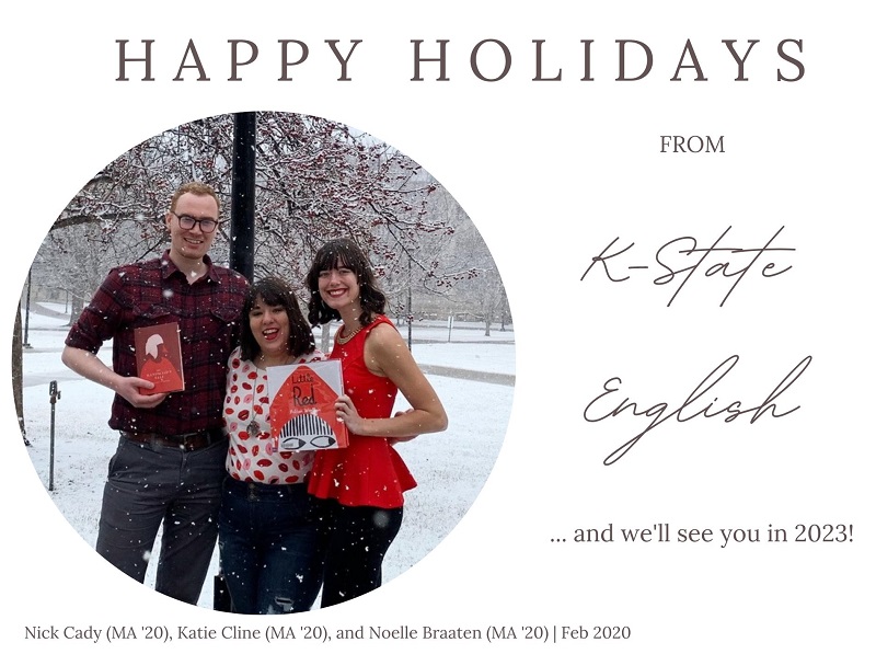 Happy Holidays Posted on December 22, 2022 by englishkstate As 2022 comes to a close with wintry weather, we send warm wishes to students, colleagues, and alums with this festive photo from 2020 taken during a less intense winter storm — stay safe all, and we’ll see you in 2023! Share this: Click to share on X (Opens in new window) X Click to share on Facebook (Opens in new window) Facebook Like Loading... Related