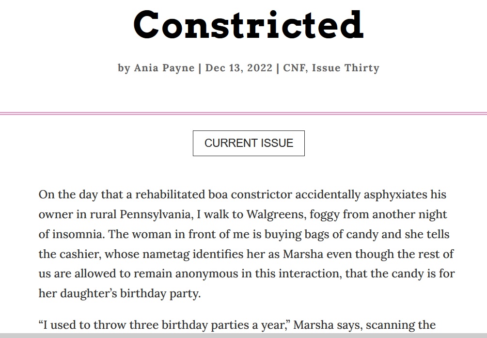 Ania Payne, “Constricted” (nonfiction). Bending Genres, Vol. 30, Dec. 2022: https://bendinggenres.com/constricted/