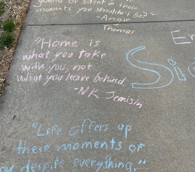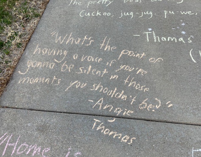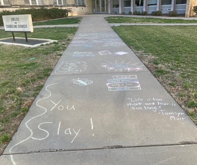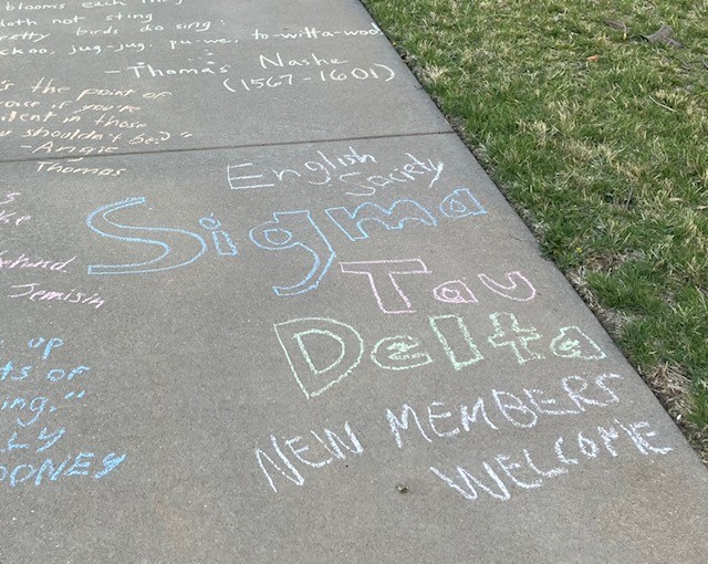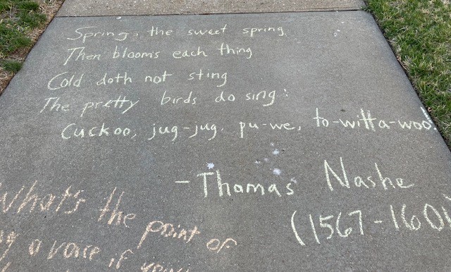 Observations: 1) Early evening on Wednesday (April 5), members of Sigma Tau Delta, our student honorary society, prepared a welcome surprise for us on Thursday morning: literary messages of encouragement, celebration, and spring. 2) Ranging across centuries, nations, and genres, the selected quotes remind us to use our voices, support each other, share love, and celebrate the season. 3) Also: “Reading rocks!” 4) As we learn above, “NEW MEMBERS WELCOME” — English majors should contact sigmatau@ksu.edu for more information. 5) Happy Spring to all!