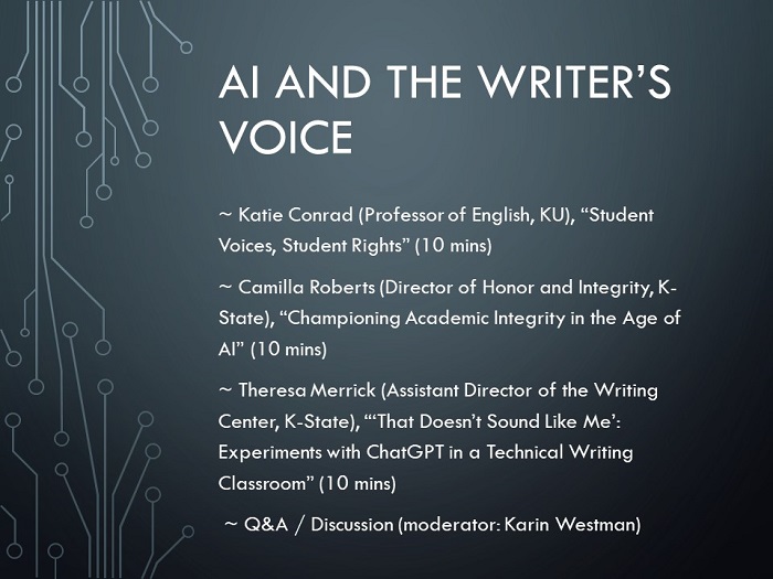 Many thanks to Katie Conrad (English, KU), whose work on Critical AI explores some of the guardrails we may need in place as we tap the potential of generative AI, as well as Camilla Roberts (Office of Honor and Integrity, K-State) and Theresa Merrick (Writing Center, K-State) for their presentations — and many thanks to our audience for their engagement and to the symposium’s organizers for their hard work!