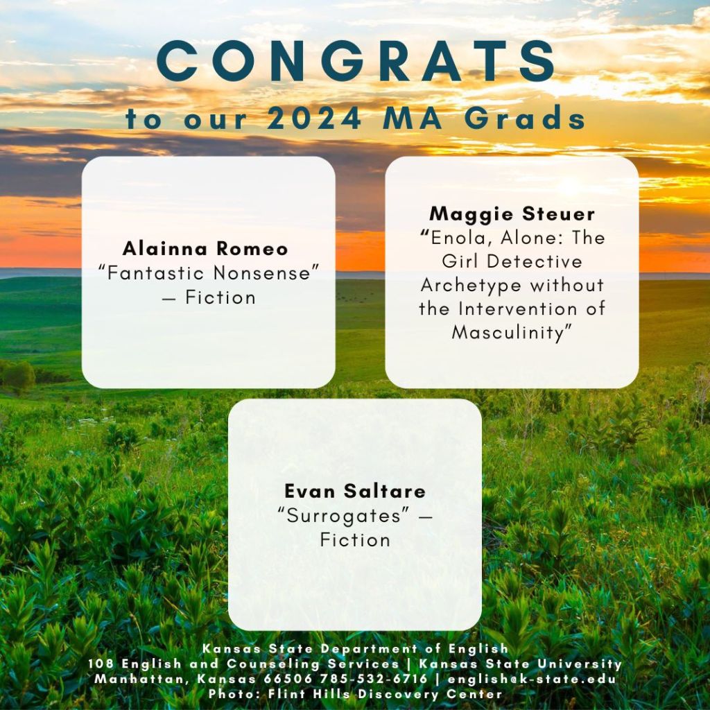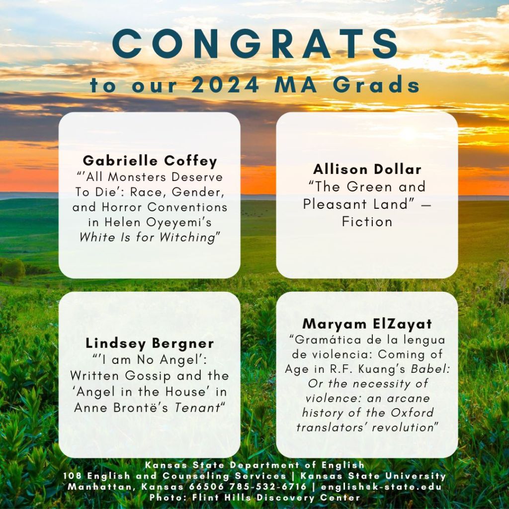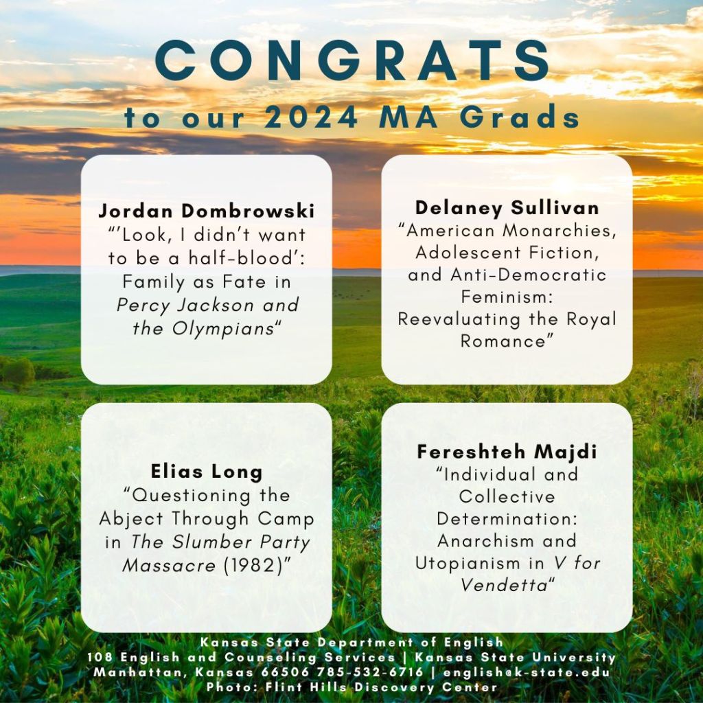 Observations: 1) Each spring, for many years, we displayed the M.A. Project and Thesis titles of our graduating M.A. students at our annual spring Awards Banquet. 2) Last year and this year, even as we’ve resumed an in-person awards celebration, we’re continuing our newer (Covid-inspired) tradition: with the help of our 2024 Graduate Program Assistant Sarah Morgan (MA ’24), we posted one of these images each day this week on our social media platforms. 3) The M.A. Project or thesis is the capstone accomplishment for our M.A. students as they complete the program and thus an important sign that graduation is at hand. While most students complete this step in the spring semester, we’ve also included in this Spring 2024 recognition M.A. students who defended their projects last fall or plan to do so this summer. 4) Congratulations to all of our new M.A. graduates!