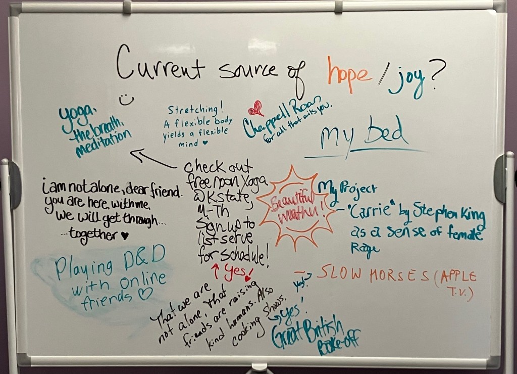 Observations: 1) Since last academic year, the whiteboard on the 2nd floor of ECS has continued to pose questions, ask for opinions and recommendations, and prompt stories. 2) For the past week, it has been collecting current sources of hope and joy. 3) In need of hope or joy yourself? The white board is offering a range of suggestions so far, including yoga, cooking shows, music, sleep, and the community and company of others. 4) If you’re in ECS this week, stop by and add your suggestion before a new prompt appears!