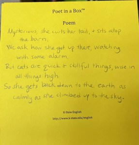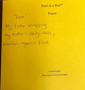 Find us inside the K-State Student Union (lower Courtyard level) from 9:00am to 3:00pm on Saturday April 12, and start thinking about the poem you’d like our poets to write just for you.