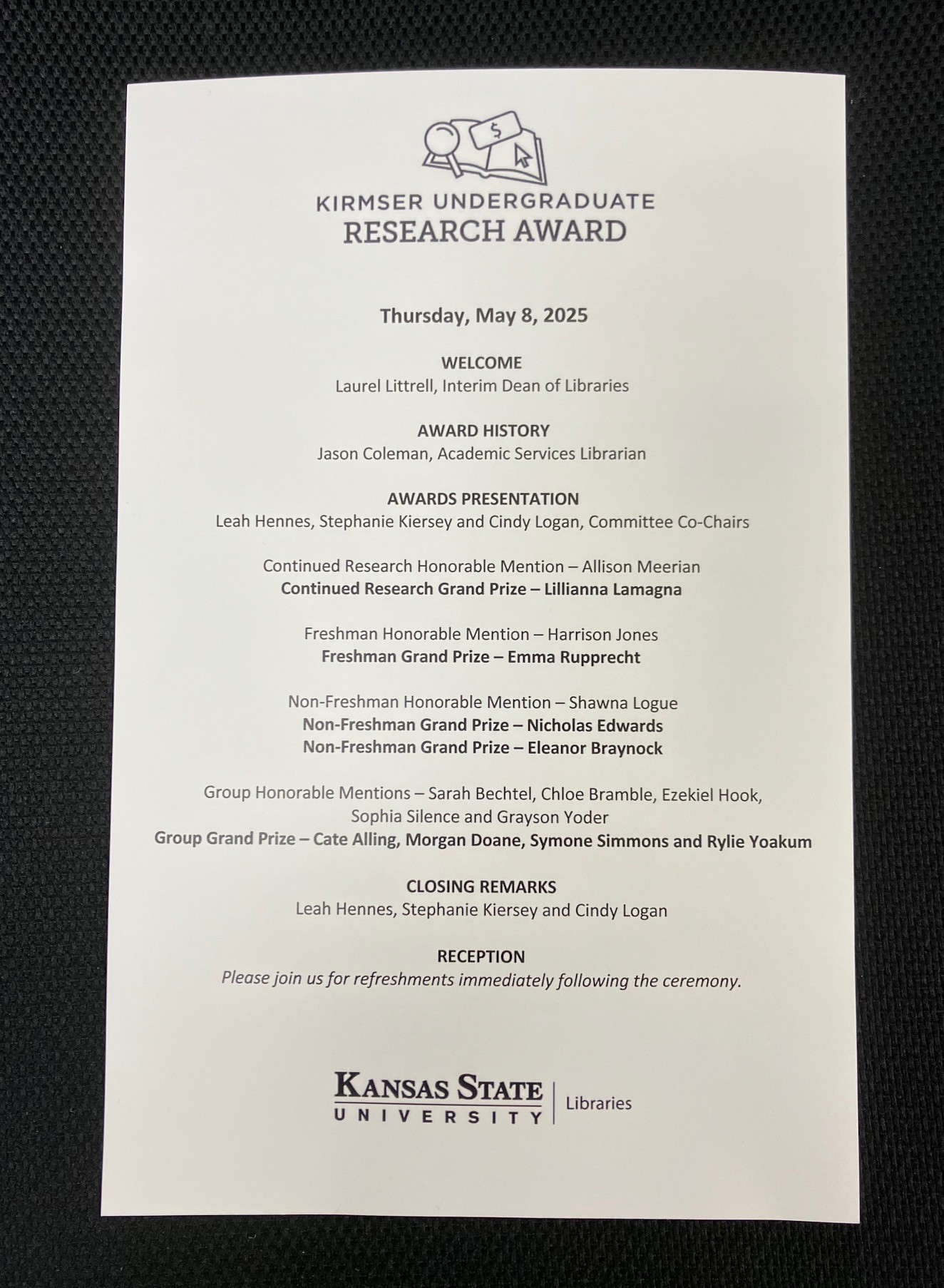 The Kirmser Undergraduate Research Awards “recognize students who have used library resources to complete a research project for a K-State course during the current academic year.” Established in 2014, the awards “recognize and promote outstanding scholarship among K-State’s undergraduates”; they are “funded by a gift provided to K-State Libraries by Philip and Jeune Kirmser.”