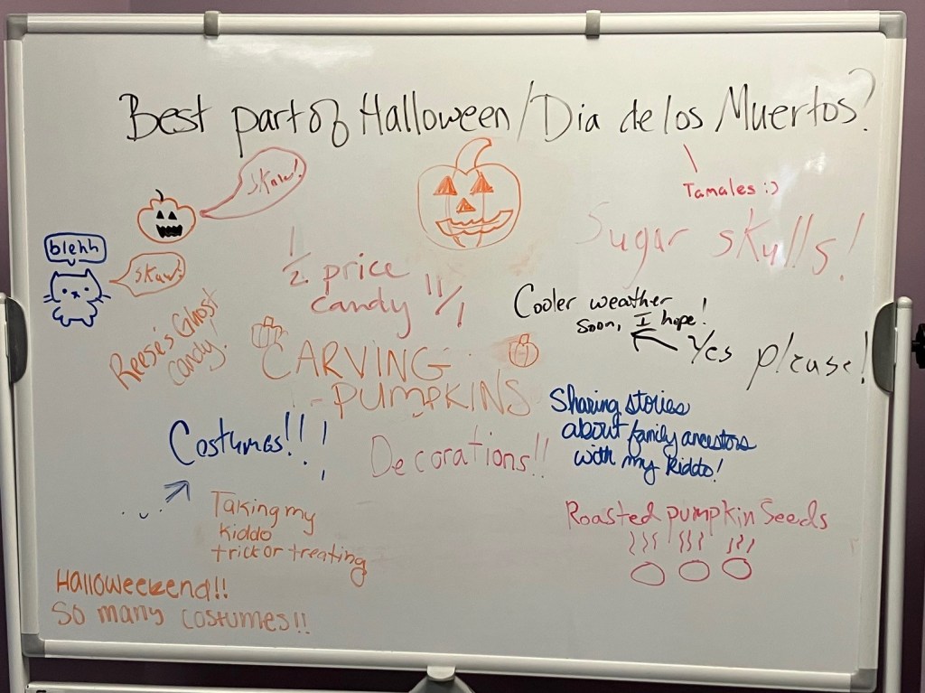 Observations: 1) Since 2023, the whiteboard on the 2nd floor of ECS has continued to pose questions, ask for opinions, and prompt stories. 2) For the past two weeks, it has been collecting favorite moments to get ready for Halloween and Dia de los Muertos. 3) From sugar skulls to carving pumpkins to cooler weather to 1/2 price candy on 11/1, there’s lots to look forward to as Halloween and Dia de los Muertos approach. Enjoy the fall days ahead!
