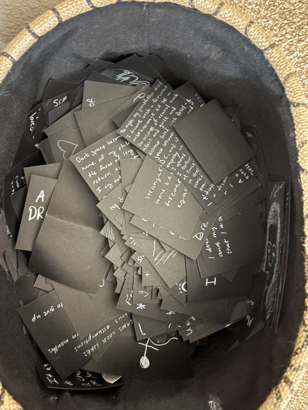 I have been taking the lines and images from museum patron’s dreams that they have left behind in a Dream Nest and crafted collaborative poems. I read what people shared and try to weave together a collective sense of dreaming from everything I’ve been given.