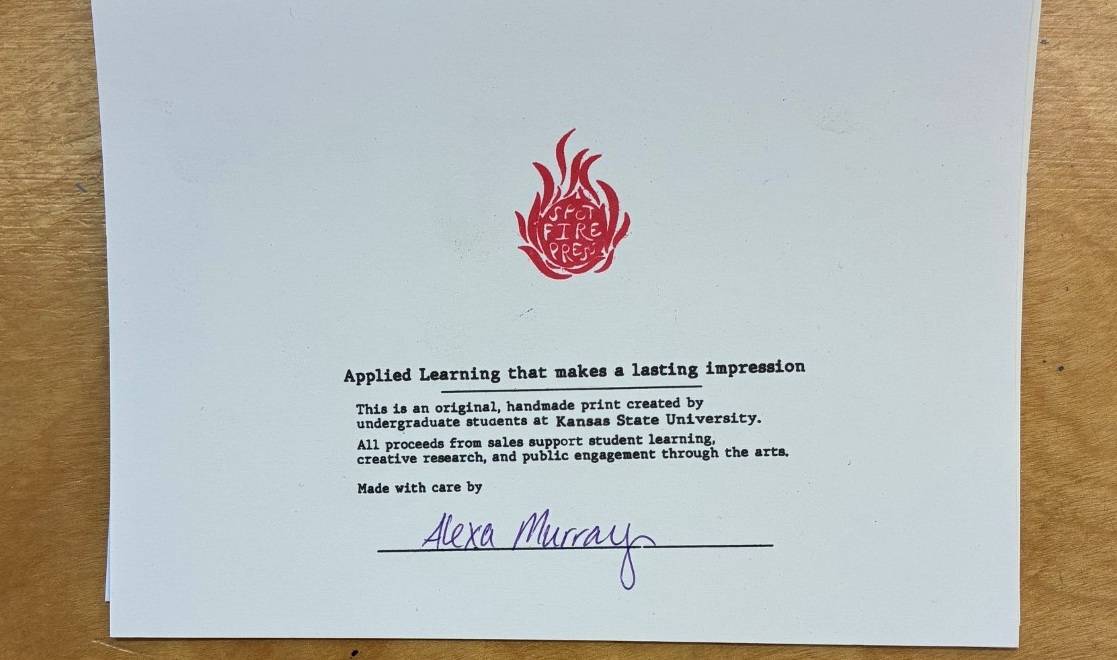 Funded by an inaugural 2025 Applied Learning Experiences (ALE) Incentive Grant, Spot Fire Press is an interdisciplinary collaboration between the Departments of Art, English, and Landscape Architecture and Regional and Community Planning, K-State Libraries, and University Printing. Through this collaboration, undergraduate students from these multiple disciplines work together with community and campus partners to design and publish creative works.