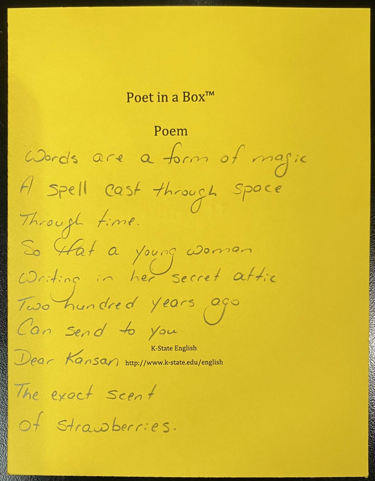 Find us inside the K-State Student Union (lower Courtyard level) from 9:00am to 3:00pm on Saturday April 18, and start thinking about the poem you’d like our poets to write just for you.